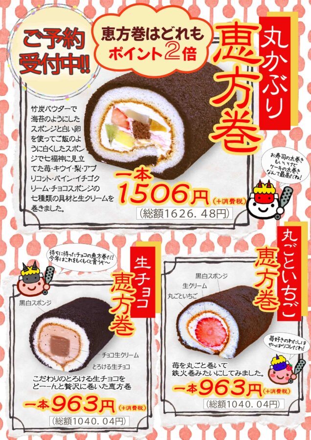 今年の恵方巻はこちら! whip2026-01-30T10:40:18+09:0026/01/30|未分類| 関連投稿 年末年始のお知らせ 秋のお客様感謝祭!20%還元のお買物券プレゼント‼ 稲城で育ったシャキシャキの梨が主役! 敬老の日のケーキ ももお待たせいたしました。